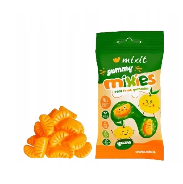 Doskonały przysmak dla małych łakomczuchów i wszystkich tych, którzy lubią odrobinę kwaśnego smaku. Yuzu to tradycyjny koreańsko - japoński cytrus pełen witaminy C. Mixies to cukierki pełne owoców, bez sztucznych dodatków, bez dodatku cukru oraz bez glutenu. Czego im jednak nie brakuje? Orzeźwiającego, owocowego smaku - są przecież z samych owoców!